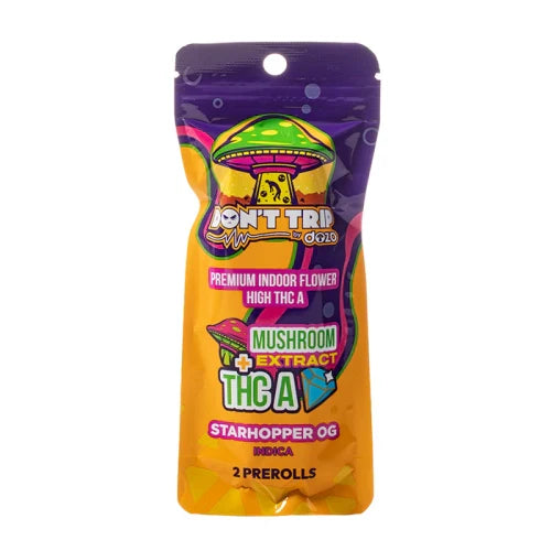 Introducing the DOZO Don't Trip Mushroom Extract + THC-A Prerolls - 3G: your passport to an unparalleled sensory odyssey. Crafted for connoisseurs and adventurers alike, each pack contains two meticulously rolled prerolls infused with a fusion of THCA industrial hemp whole flower and mushroom extract, offering a bespoke experience tailored to your cravings. Whether you seek the thrill of exploration or the serenity of introspection, the choice is yours. Beyond their sensory allure, these prerolls redefine convenience, pre-packed and ready for action, offering pure, unadulterated enjoyment at your fingertips. Elevate your ritual with a touch of novelty and sophistication, and embrace the boundless possibilities that await with the DOZO Don't Trip Mushroom Extract + THC-A Prerolls.