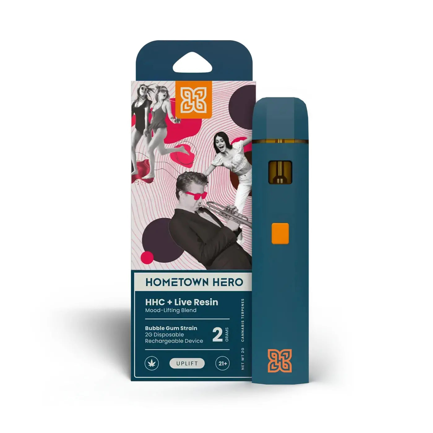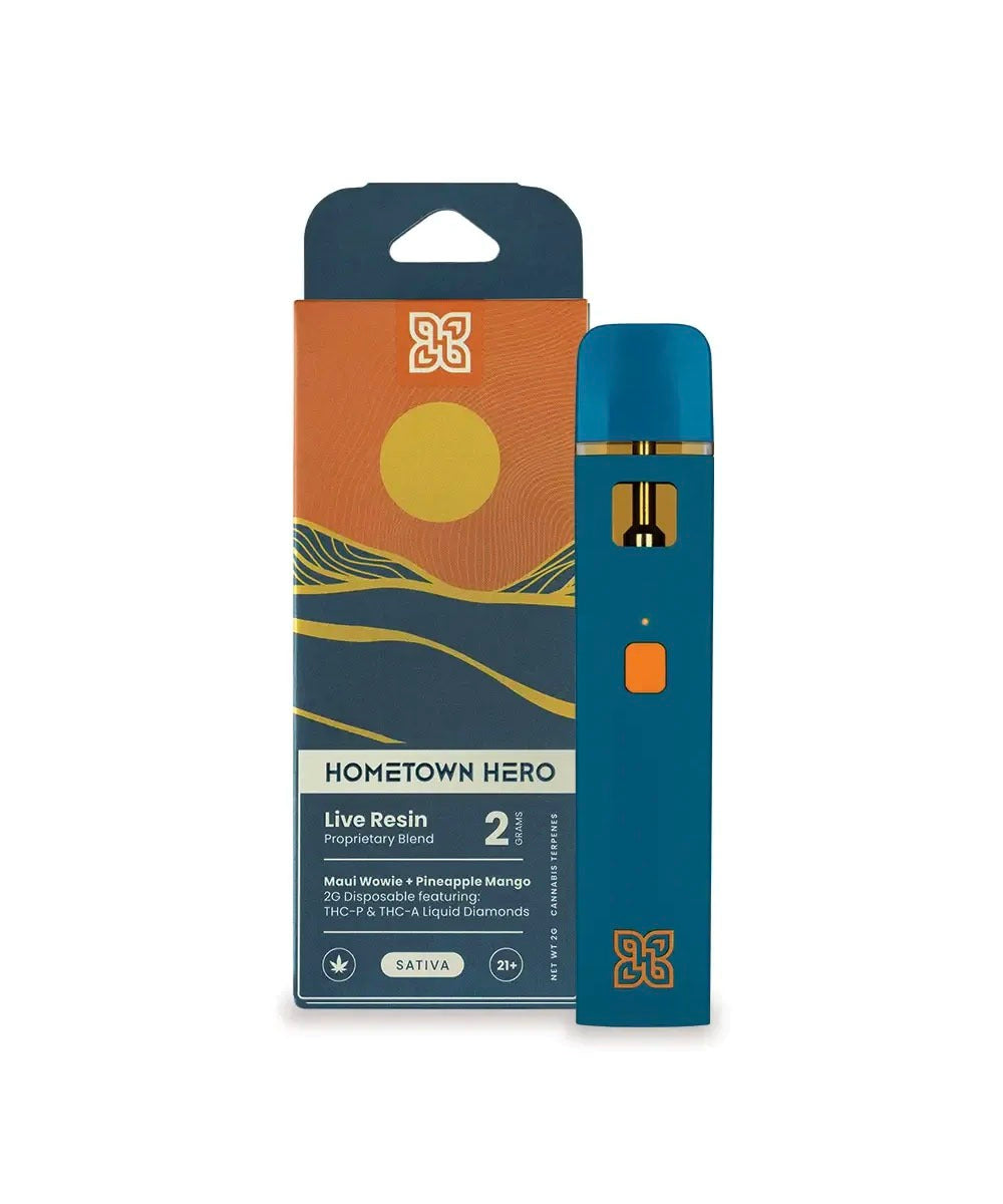 These top shelf disposable vaporizers from Hometown Hero contain a proprietary 2-Gram blend of THCA Liquid Diamonds, Delta-8 and HHC, flavored with terpene-rich live resin from the Maui Wowie strain.