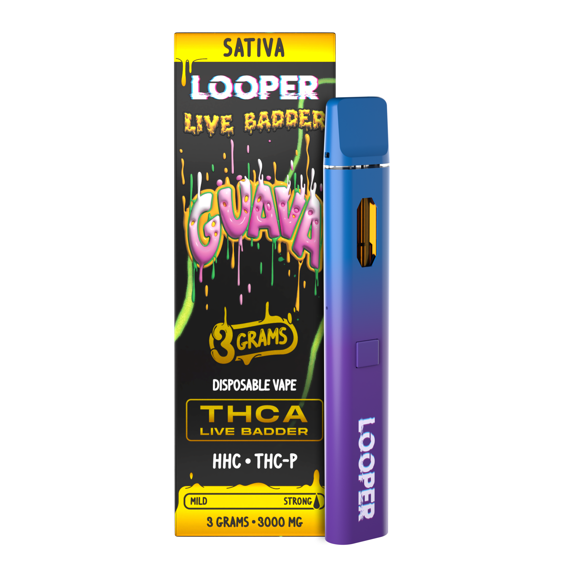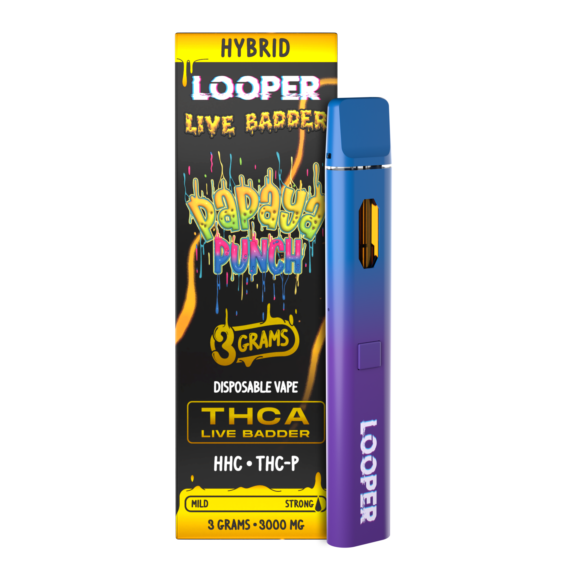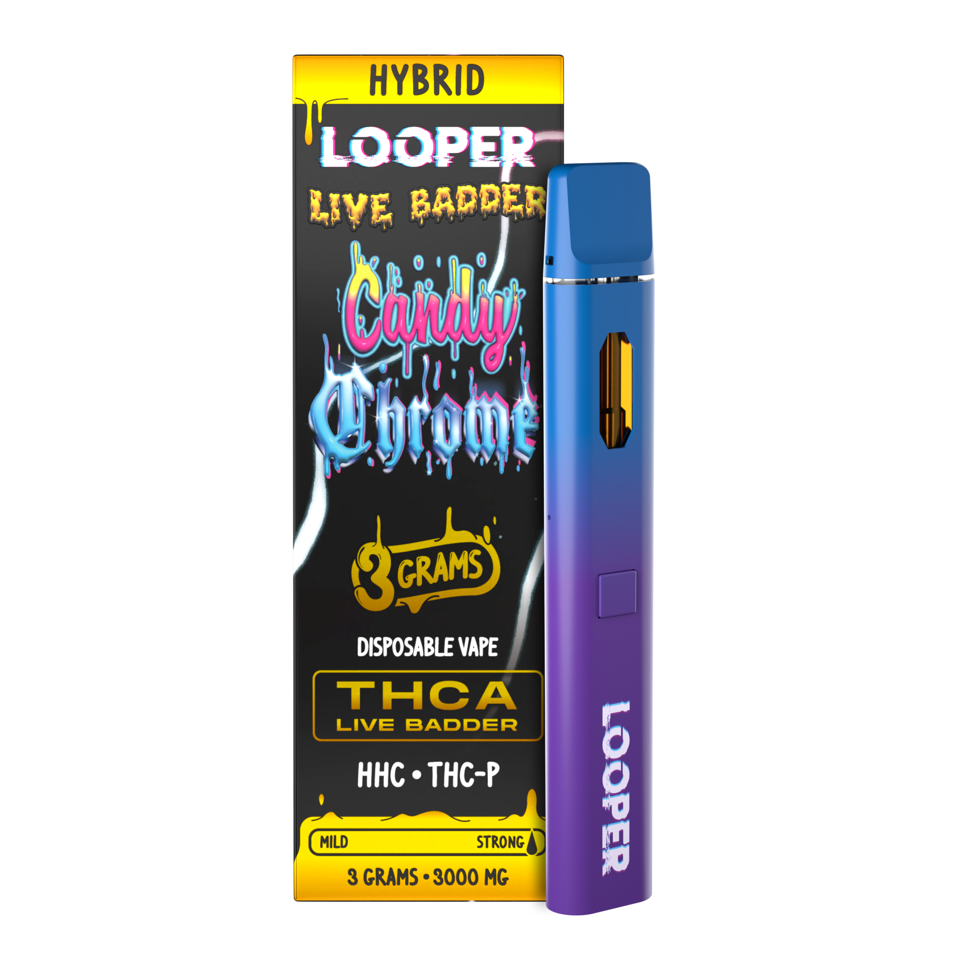 Shop the Looper Live Badder Disposable 3G, offering 3 grams of THC-P and HHC Diamond Live Badder inside a convenient disposable vape packed with terpenes.