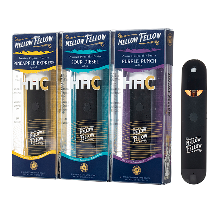Check out Mellow Fellow HHC Disposable, featuring 2 grams of HHC cannabinoids and hemp derived terpenes inside a convenient disposable vape system.
