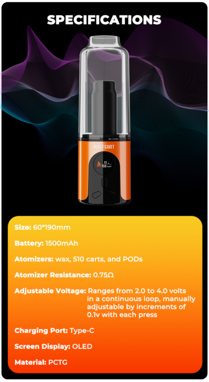 The market’s typical e-cigarettes usually support only two types of vaporizers, while PuffShot is compatible with three: wax, 510 carts, and PODs. This allows users to choose based on personal preference, offering a more personalized experience.