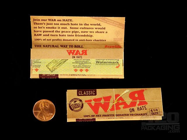 These 1¼ rolling papers are the classic 1¼ that many have come to love. What makes this paper so special is that RAW will donate 100% of the net profits from the sale of this paper to charity! When you buy a pack of WAR paper, you will be supporting anti-hate organizations like Peaceful Protestor Bailout Funds & the Martin Luther King Center.